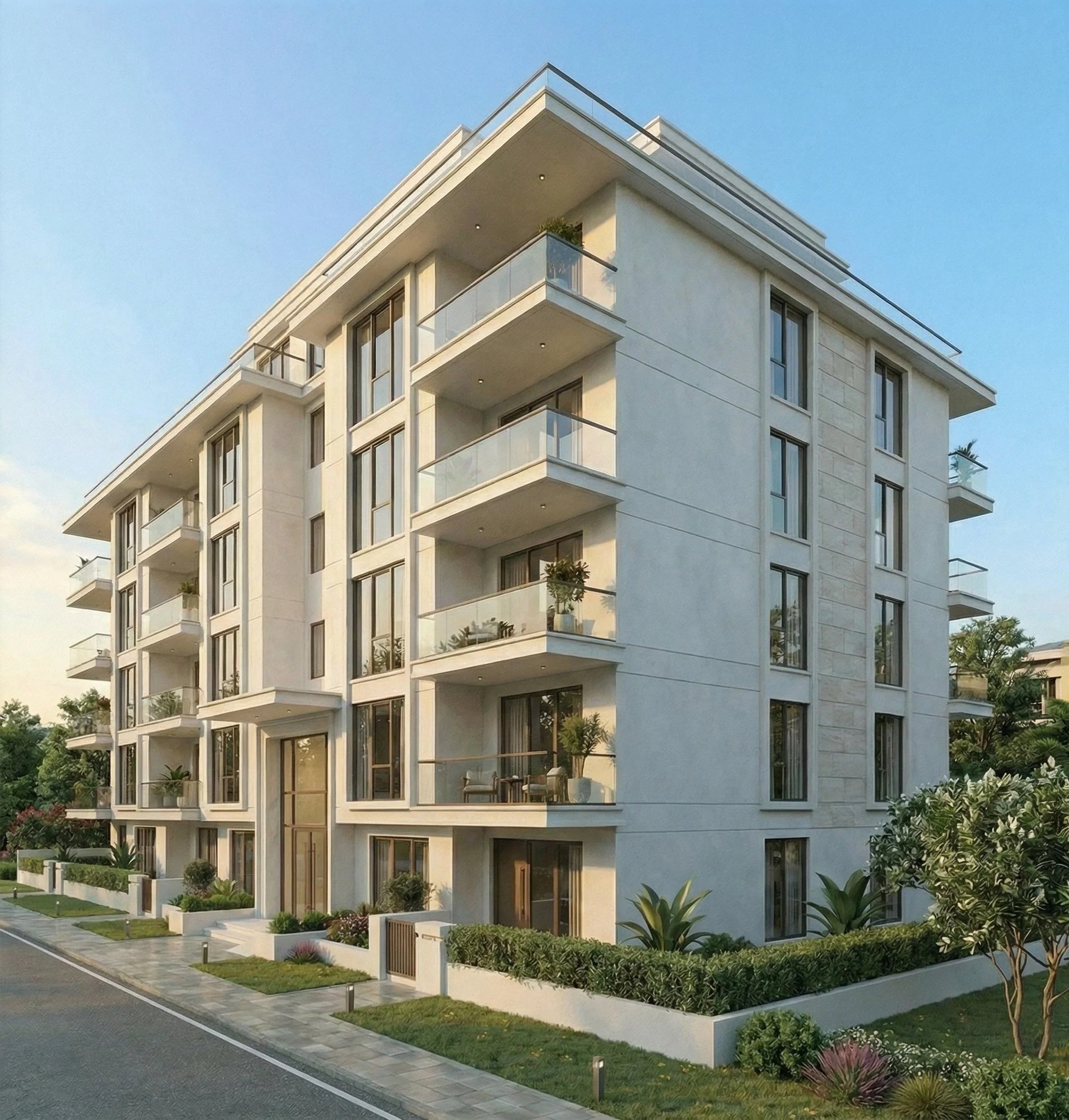 Das architektonische Konzept folgt der Idee eines resortartigen Boutique-Hotels mit klarer, zeitloser Formensprache und einer starken Verbindung zwischen Innen- und Außenraum. Der Baukörper gliedert sich in fünf oberirdische Geschosse mit großzügigen, lichtdurchfluteten Apartments sowie eine exklusive Penthouse-Etage.